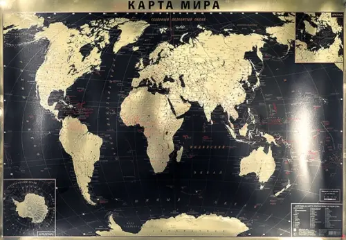 Интерьерная карта мира (политическая) (GOLD).На картоне, отделка золотой фольгой, в прозрачном тубусе.Масштаб 1:38 000 000.Размер: 90х60 см.
